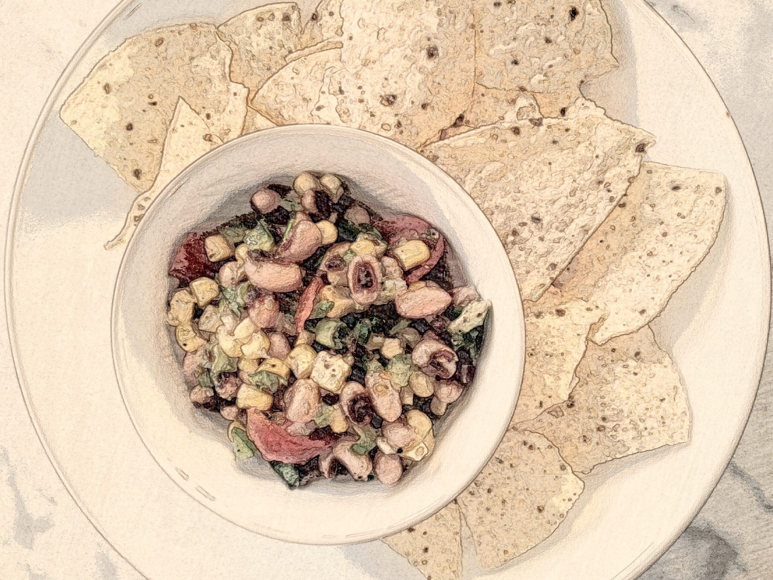 On to the recipe.  This is a salad that I put together a couple of days ago based on recipes I have seen and tasted.  It also uses up some of the odds and ends veggies from the corners of the fridge and saves them from a slow death.  I’m calling it a salad, but it could be called a salsa if you want, and it’s also called Texas Caviar in some forms as well.  As you’ll see, the recipe isn’t super exact and that’s because I didn’t want it be a recipe you have to follow to the letter.  It is one of those that you can tinker with to suit your preferences and fridge inventory.  It will be good, no matter what, and here is what it looks like: