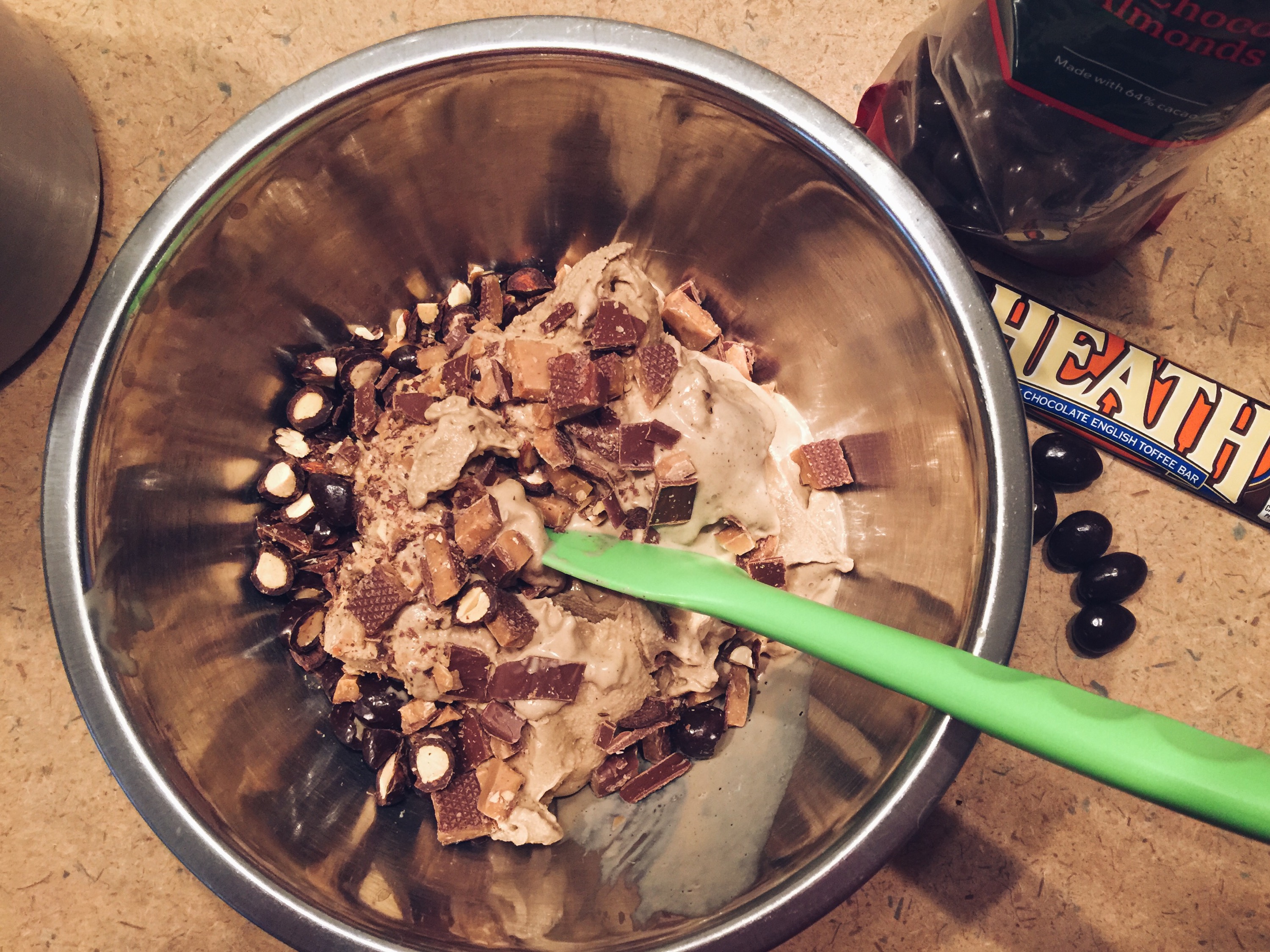 Freeze the ice cream according to the manufacturer’s instructions. When the ice cream is ready to place into a deep freezer (it will be soft-serve consistency) stir in the chopped toffee and chocolate almonds.