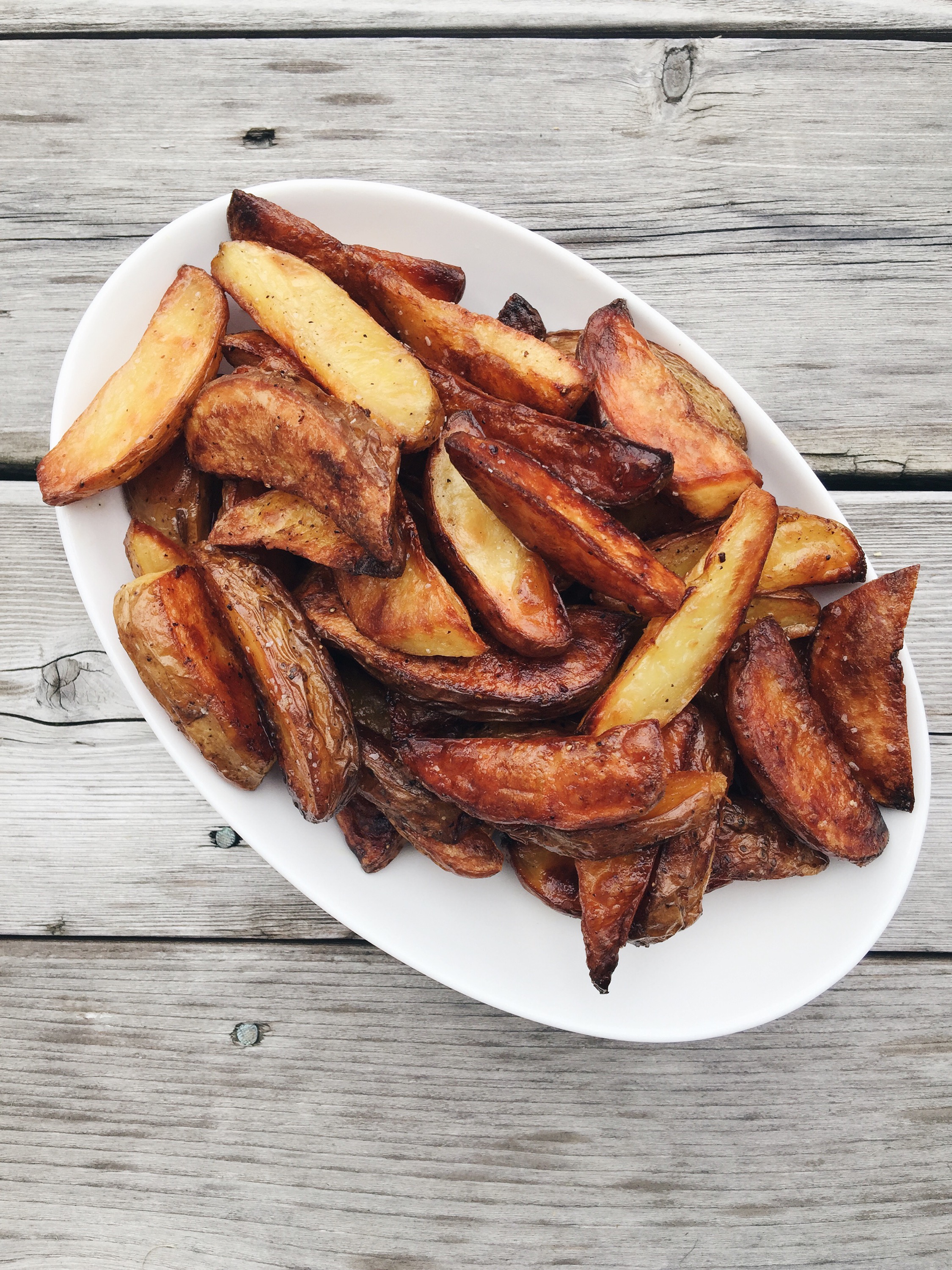 Wash and dry the potatoes. Leave the peel on, since it is thin and adds flavor. Cut into wedges, about 6-8 per potato.