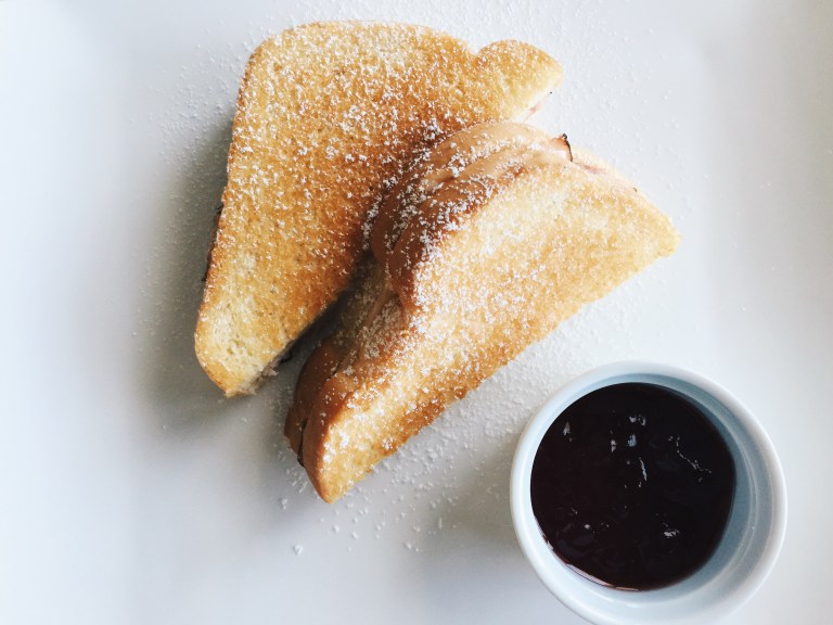 After the sandwiches are cooked, transfer to a wire rack or plate, cut in half and sprinkle with powdered sugar. Dip in raspberry jam between bites for optimal deliciousness.