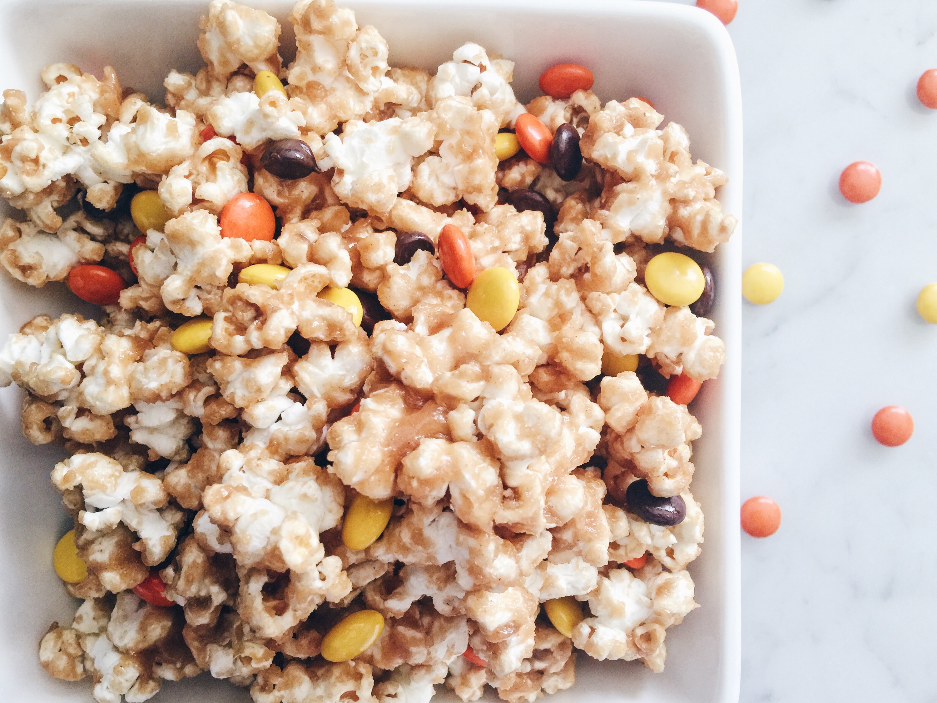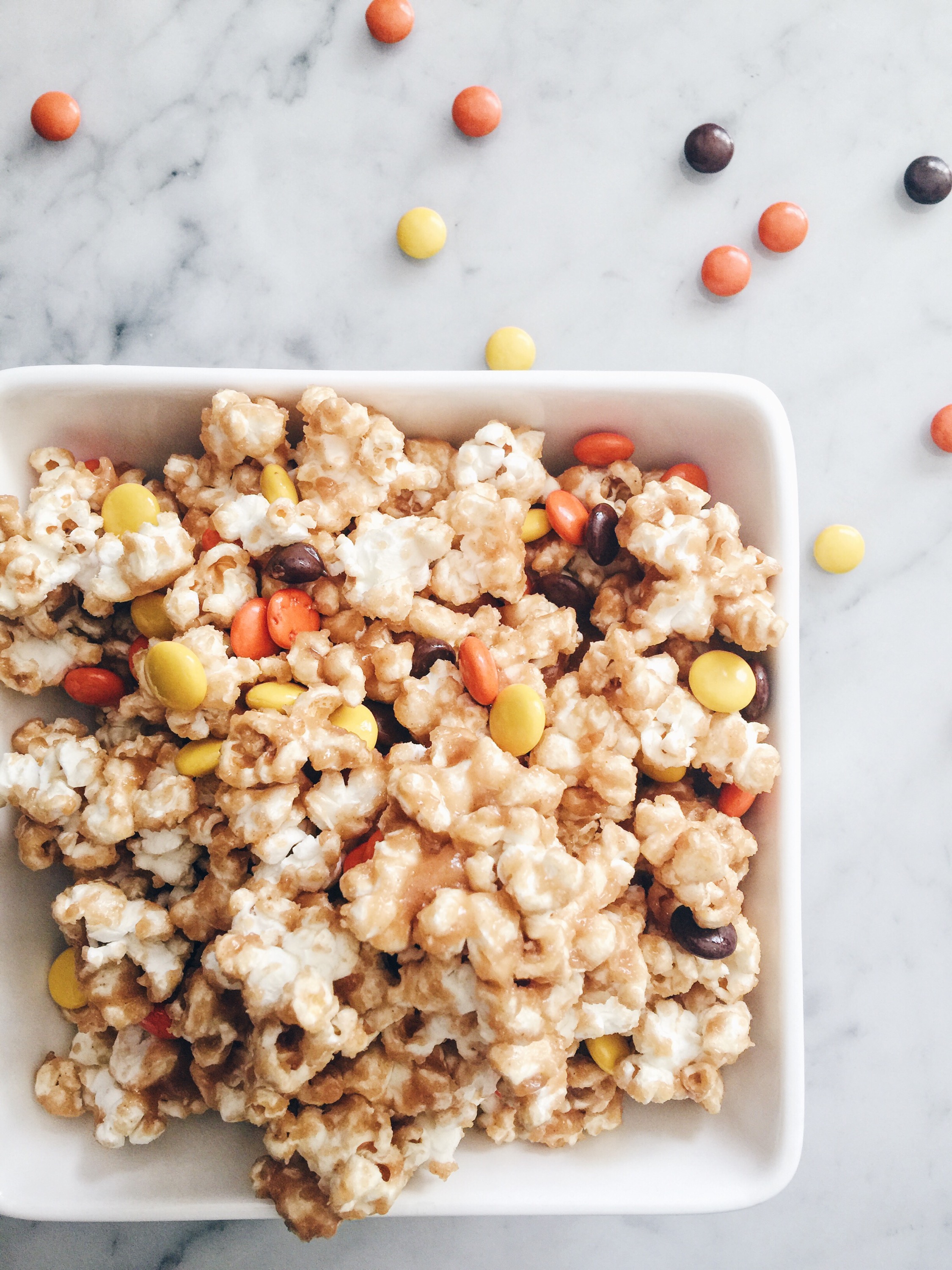 Drizzle ganache over popcorn, stirring to coat. Let cool, then sprinkle with Reese’s Pieces. Enjoy slightly warm for the optimal gooey peanut butter texture.
