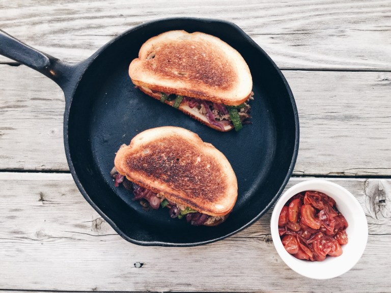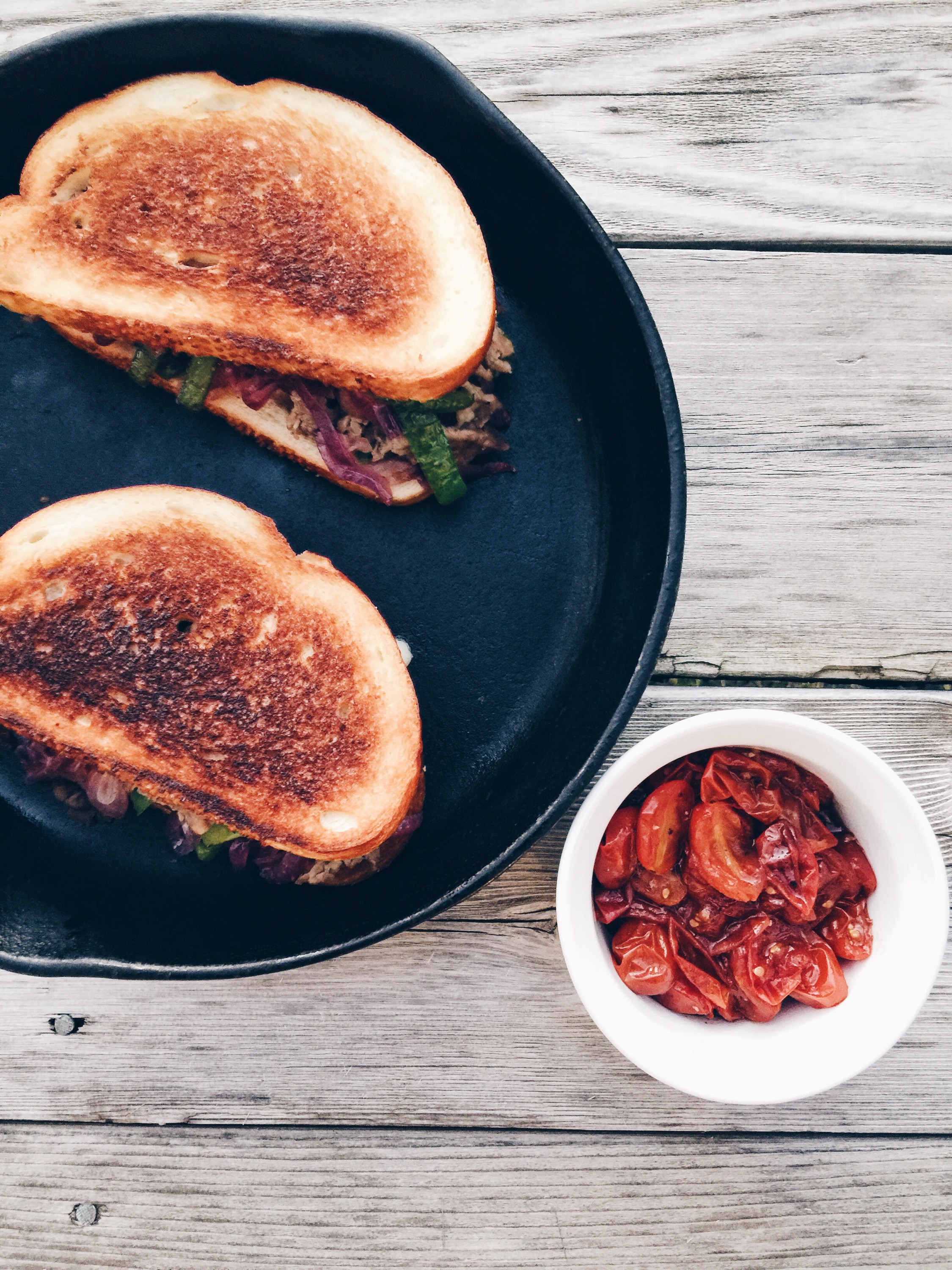 This is a late post, but I promise it’s for a good reason. These sandwiches. Usually, in blog-world, recipes are made and photographed quite some time before they are posted. This was what we actually ate for dinner tonight and they were so good that I didn’t want to save it for a later post. It may be too late to make them tonight, but you can consider it a jumpstart for tomorrow’s menu. These are a version of grilled cheese sandwiches, with a little shaved steak, lots of delicious vegetables, melted cheese, and a quick tomato jam. Perfect for a cool Fall evening, these can also be made without the steak for my vegetarian friends, and they’re just as good. Here’s how to make them, and if you give them a try, let me know what you think. I’d love to hear from you!