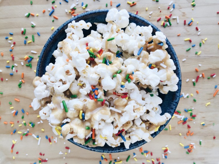 Off the heat, add the vanilla and fine salt and stir. Drizzle over the popcorn on the lined tray and top with the sprinkles. Sprinkle over the kosher salt to taste, about 1/2 teaspoon. The little bursts of salt with the sweet marshmallow drizzle and crunchy sprinkles are perfect for each other.