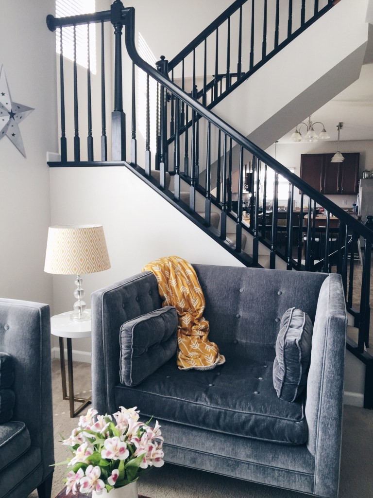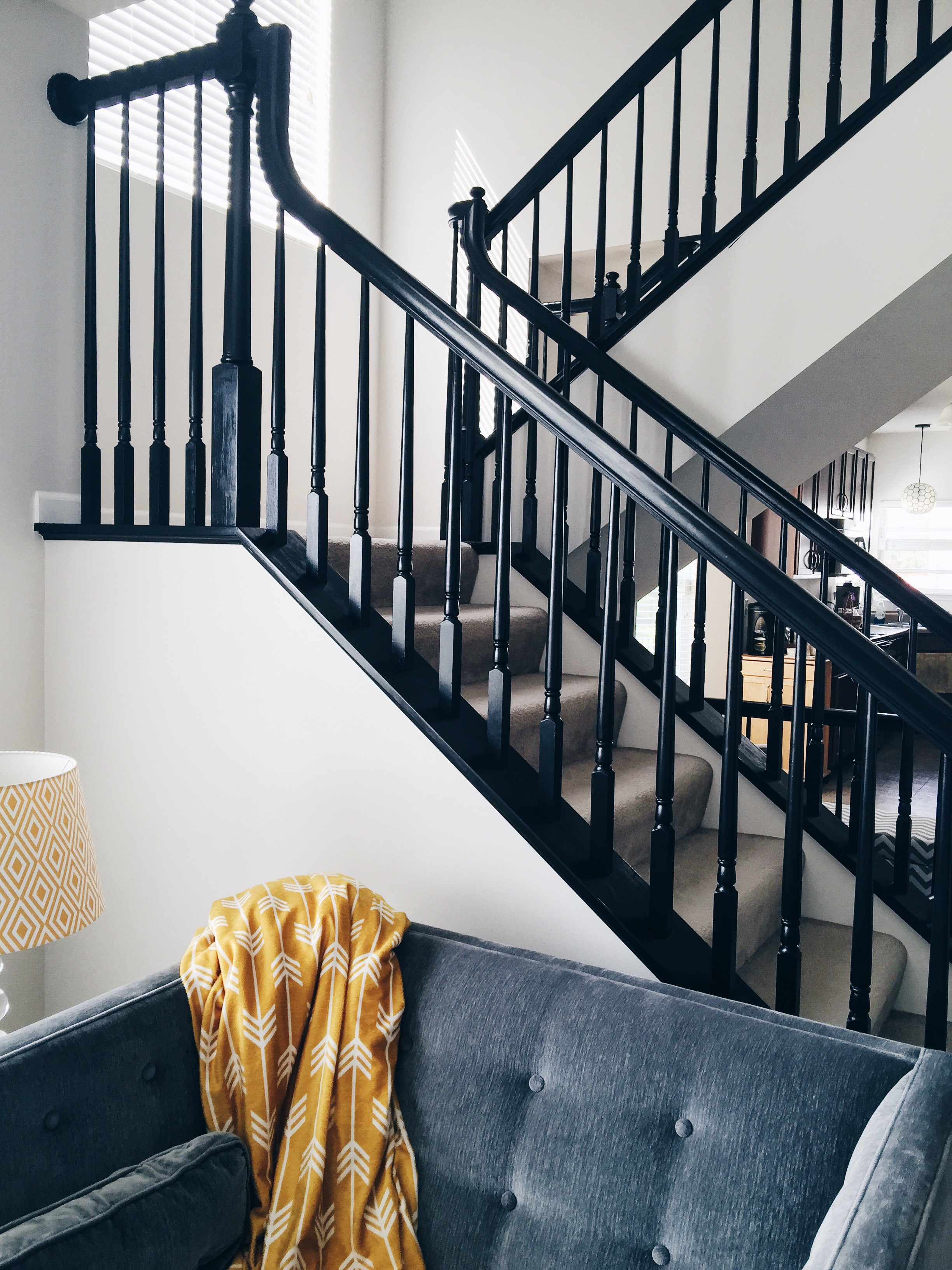 I found that the decisions I’ve made style-wise are best when I don’t second guess them. The more I second guess them, the more I tend to talk myself right out of them. As a result, I’m often much happier at the choices and the impact it has on the space. See my bold black and white striped guest room, or my indigo bedroom with its gold dots and edison bulbs. Both of those decisions were made right before going to the store for paint, and I didn’t spend a large amount of time debating them. So it should come as no surprise when walking into the kitchen last week, I had a thunderbolt of an idea to paint the stair railings black.