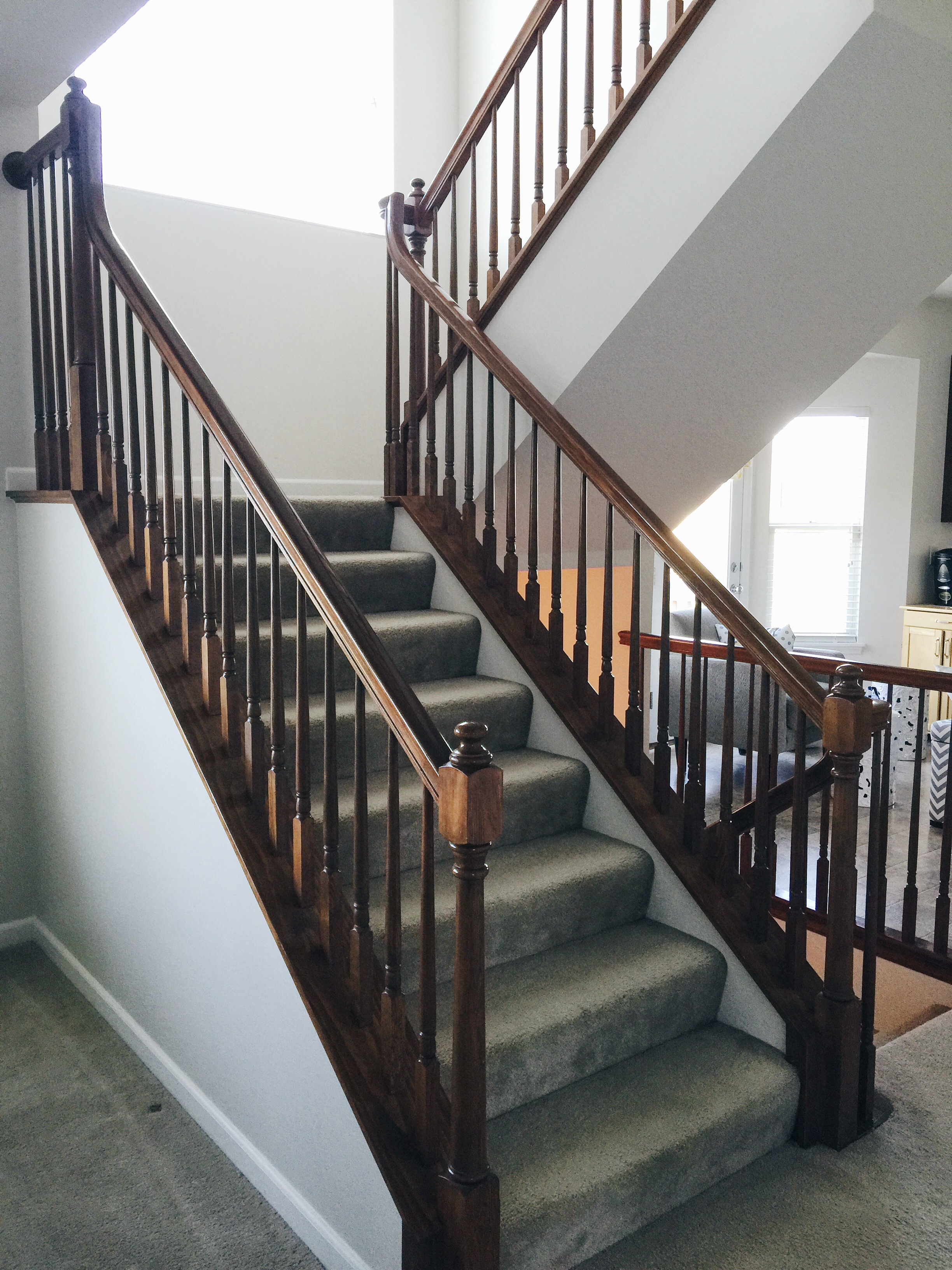 Why black? I say why not black? I think, if used thoughtfully, black lends a little edge and sophistication to any space. Not saying I’m the most edgy or sophisticated person out there. I’m certainly not. I just like what I like, and I saw a pattern emerge in the spaces I was drawn to. They all had somewhat industrial light fixtures, large scale artwork, and black trimming, whether they be window sills, baseboards, or railings. So when faced with my very brown staircase (which I had always felt was out of place), and the onset of spring-like change and renewal, I suddenly had the urge to paint it, and paint it in a bold way.