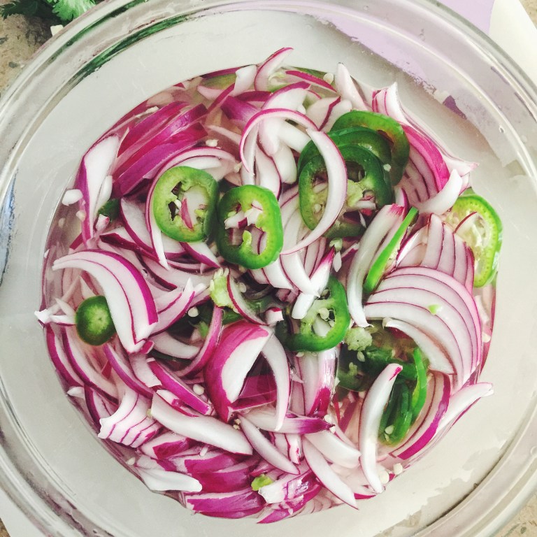 In a medium bowl, place the sliced onions and jalapeños. Set aside.
