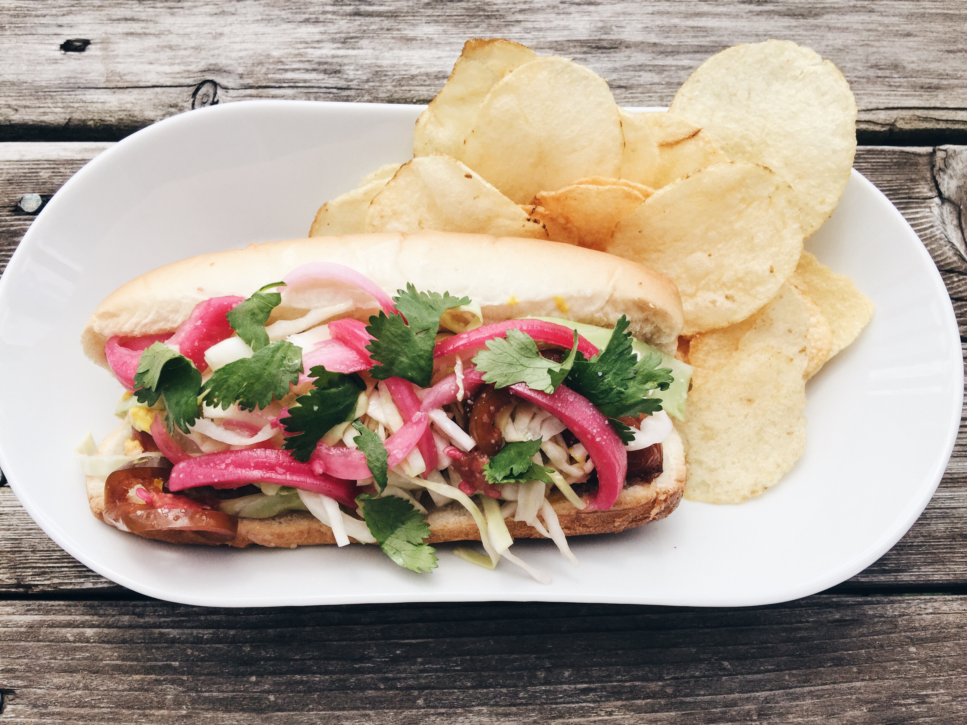 Place a smoked sausage in a bun and drizzle with mustard. Place some of the cabbage slaw on the sausage and top with the pickled onions and jalapeños. Top with a little cilantro. Devour.