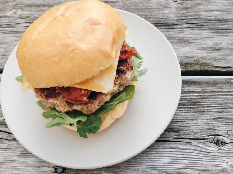 I’m here to remedy that, and share with you our recipe for turkey burgers that are juicy, full of flavor, and not boring. This lovely version sits on a bed of arugula, is slathered with a tomato and onion compote, and topped with melty cheese, all on a pillowy brioche bun. There’s certainly nothing boring tasting about any of that, and if you’ve got the grill fired up, it adds even more layers of flavor. Don’t worry though, they are just as delicious made in a skillet on the stovetop.