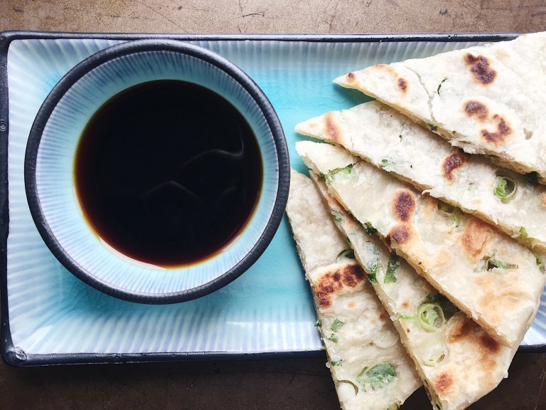 Remove to a plate and cut into wedges. Serve with a dipping sauce made from equal parts soy sauce and black vinegar. Repeat with the remaining dough, serving them fresh from the skillet. Enjoy, and let me know how you liked them!