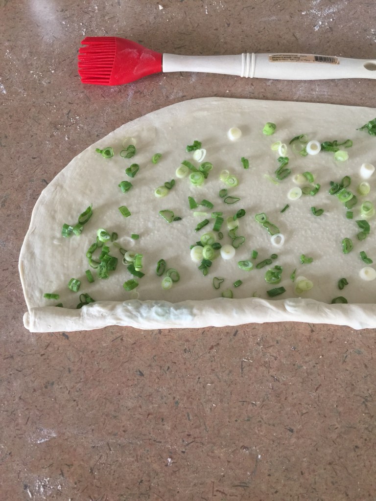 Flatten slightly with your hand and roll into a circle about two hands across in diameter, adding a little flour as needed. There may be a few scallions that peek through and that’s okay. If the dough keeps snapping back, let it rest for a few minutes and try again.